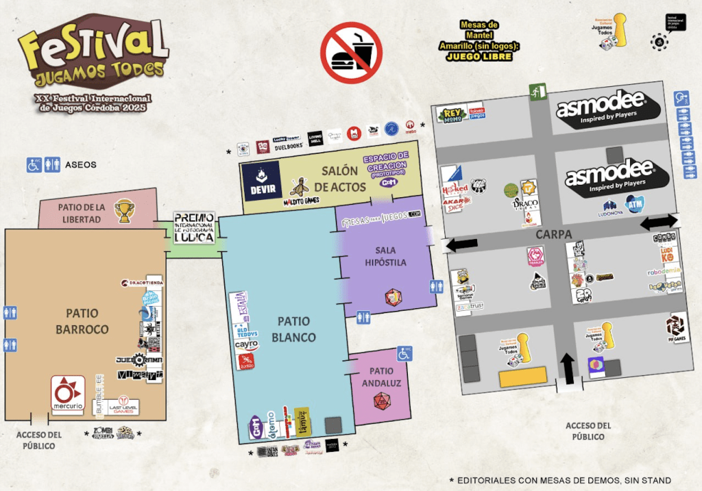 Y aquí tienes el plano de todo el festival: con las zonas de juegos, barra de préstamo y todas las editoriales y tiendas que estarán presentes. Estúdialo bien para que no dejes ni un rinconcito sin visitar.